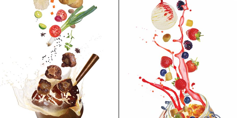 To do Food Freeze Photography is a team work between human and technology. The concept was drawn for each ingredients shoot. Each ingredients was shoot separately then we digital imaging them. Well it was a good 3 days shoot and a week of post production. The freeze was happened because of the flash synchronisation that able to freeze the object.